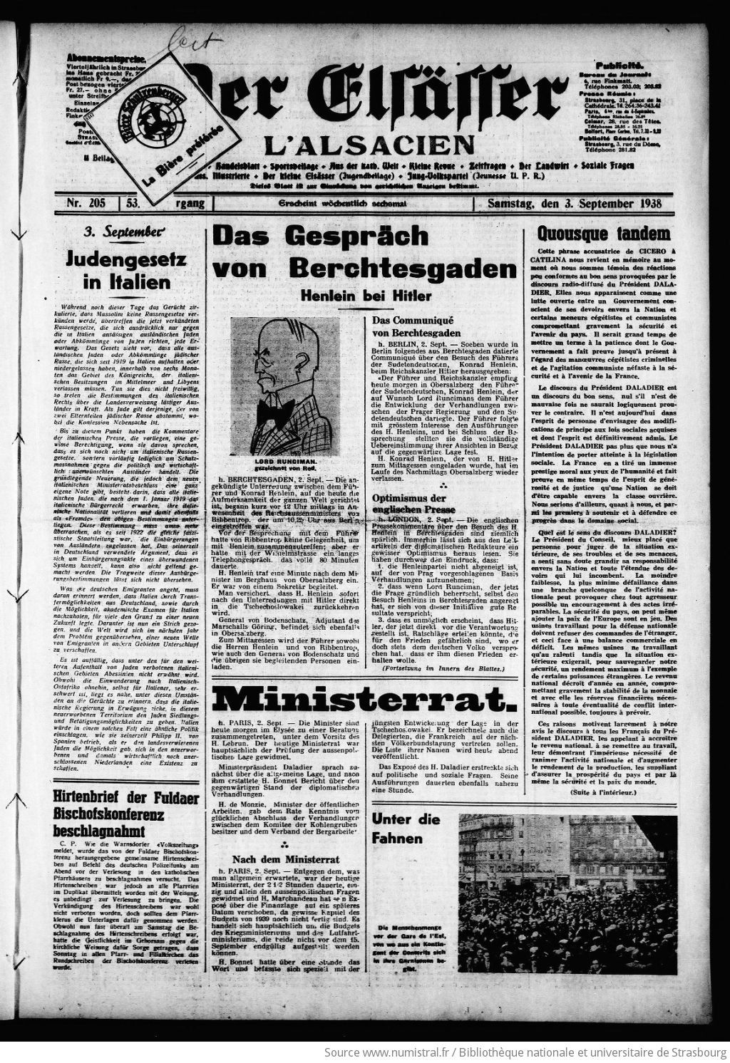 Le second événement, très important dans la vie politique française, fut le Front Populaire de 1936. La coalition des radicaux, des socialistes et des communistes aux élections législatives du mois de mai de cette année obtint la majorité à la Chambre des Députés et aboutit à la constitution du ministère socialiste Léon BLUM. A l'issue de grandes grèves, les ouvriers obtinrent des réformes sociales importantes : semaine de quarante heures, conventions collectives, les premiers congés payés. Une activité intense et tapageuse que manifestait les journaux de droite alsaciens. Surtout le « Elsâsser » fulminait contre le Front Populaire et Léon BLUM, le Président du Conseil.