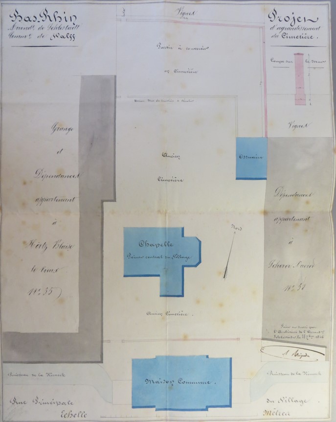 Plan de 1846 prévoyant la construction d'un mur (dessin en haut en rose) qui devait délimiter les limites après l'agrandissement du cimetière et l'acquisition de la parcelle de Paul SCHERER. On note qu'il existait un mur entre la mairie et la chapelle Sainte Marguerite et que l'on voit très bien la déviation de la Kirneck opérée après la construction de la mairie