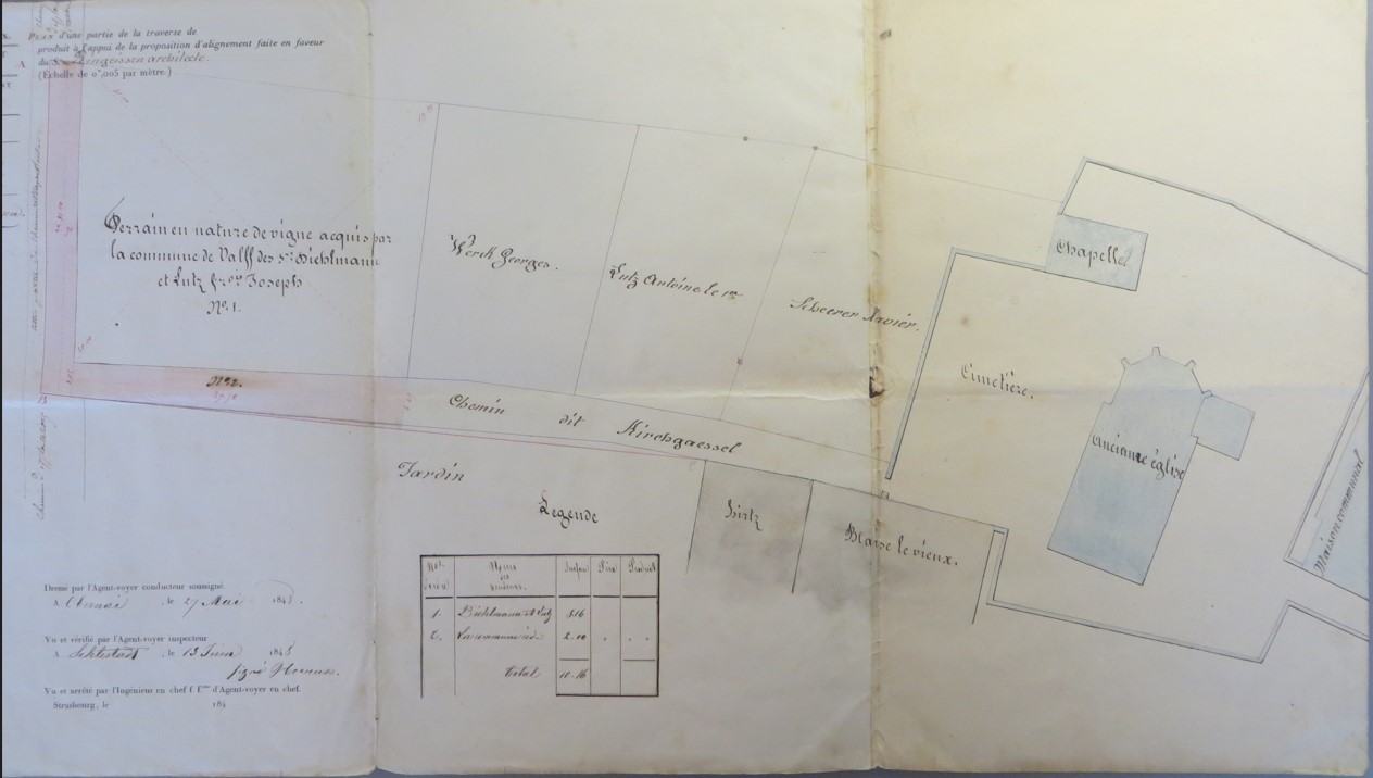 Plan de 1848 prévoyant l'alignement du chemin dit « Kirchgaessel » après l'achat des terrains de vignes au Nord à Célestin DIEHLMANN et François Joseph LUTZ. Entre l'ancien cimetière et les nouvelles parcelles acquises, il reste encore à acheter pour pouvoir agrandir le cimetière, les parcelles appartenant à Georges WERCK, Antoine LUTZ et Xavier SCHERER