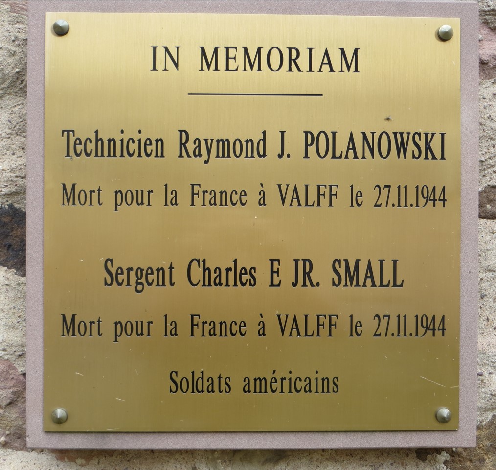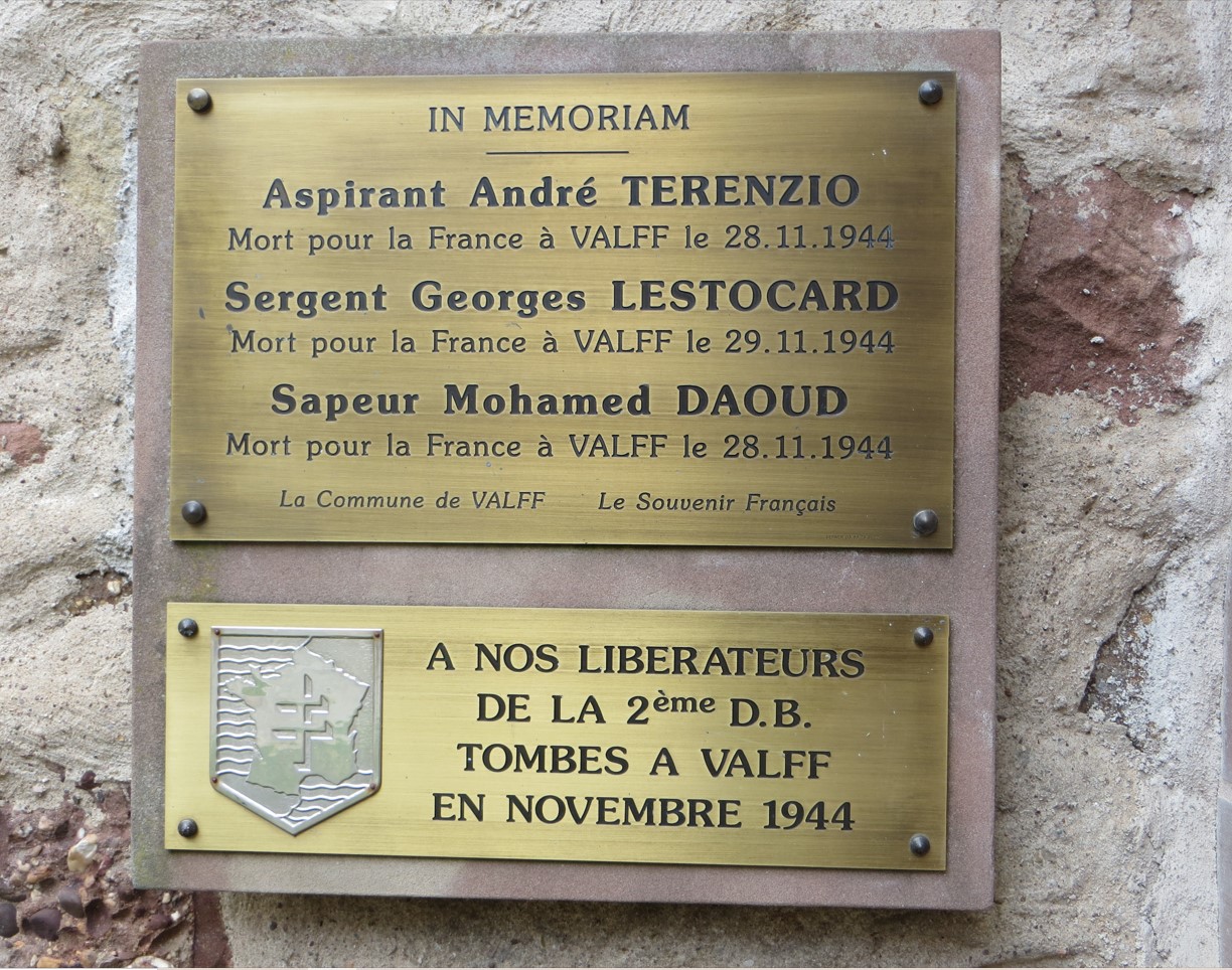 En novembre 1944, 14 soldats allemands trouvèrent la mort à Valff [en savoir plus : Enquête sur les derniers soldats allemands à Valff] et furent enterrés dans notre cimetière. Ils furent exhumés en 1958 et transférés dans le cimetière militaire de Niederbronn. Un jeune aspirant français trouva également la mort le 28 novembre 1944 à Valff (André Gilbert TÉRENZIO, 22 ans). Il fut également inhumé au cimetière, mais transféré plus tard dans sa terre natale. Une plaque commémorative a été fixée au mur du cimetière en mémoire de ces militaires [en savoir plus : Inauguration de la plaque souvenir en mémoire des soldats tombés à Valff].