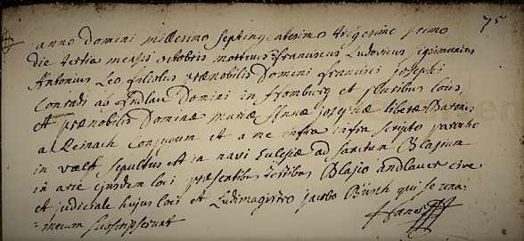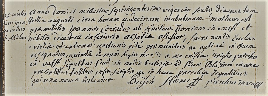 Acte de sépulture de Jean Conrad d'ANDLAU en date du 3 août 1726, assesseur de la région Basse Alsace, enterré dans l'église St Blaise de Valff
