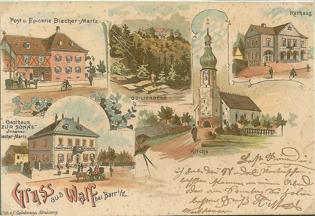 En 1836, WISS Chrétien (Valff, 1779-1865) est appelé cabaretier avec son épouse Madeleine WILLENBERGER (WINTERBERGER) et deux filles issues d'une première union. Chrétien s'était marié en première noce avec Barbara KAPSZ, décédée à Benfeld. En 1829, sa fille Françoise, 18 ans, est frappée mortellement par la foudre, vers 18 heures, au lieu-dit Litzelfeld à Bourgheim. À cette époque, Chrétien est journalier à Valff et veuf. L'auberge se trouve à côté d'un certain REIBEL Jean Antoine, chandelier, qui est le neveu de Anne Barbara REIBEL. Son mari, Jacques KACHELOFFEN, ancien officier dans l'armée royale de la Marck, originaire de Spire, et a quitté son poste de militaire et a épousé en 1785 Anna Barbara. Il a ouvert une auberge à Valff. La proximité de REIBEL et WISS pourraient correspondre à la même localisation de l'auberge.