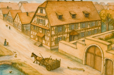 Essai de reconstitution de l'école, l'ancienne auberge et tribunal « À l'arbre vert » à Valff. A droite, entrée du presbytère