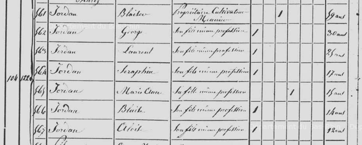 En 1851, il n'est plus question d'auberge. Jordan est cultivateur et meunier. Pour vous donner une idée des difficultés à situer les maisons et les noms, le moulin a maintenant reçu le n°104 ! Nondebip ! 💩