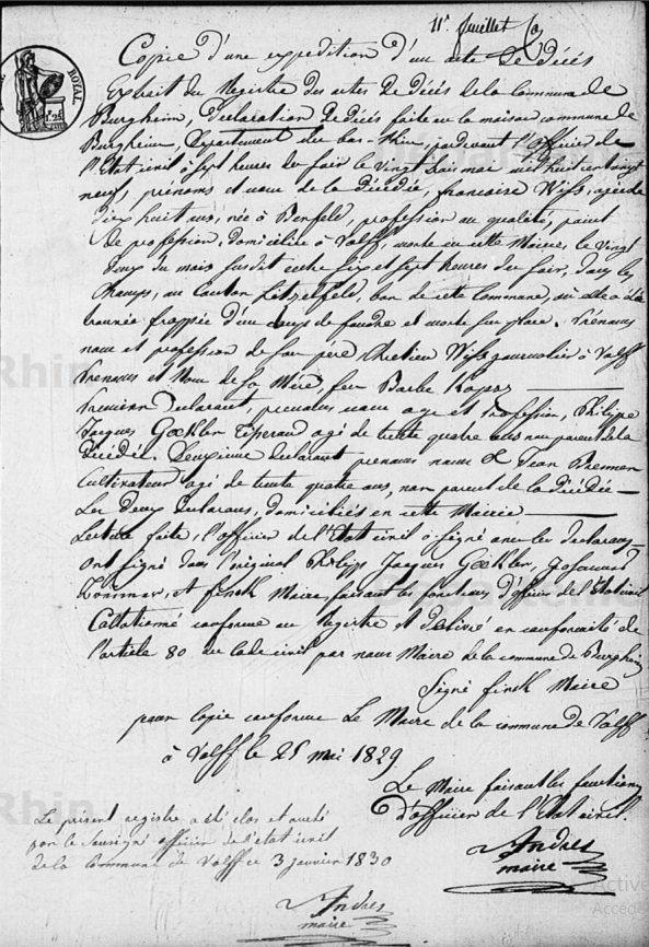 - A la naissance de ses filles Madeleine et Félicité et de son fils François Xavier, le secrétaire de mairie indique le numéro de maison 71. Au décès de HIRTZ Félicité, le témoin est son fils Xavier, 26 ans, cabaretier. Xavier ne restera pas à Valff. La maison est vendue. Il s'installe à Saint-Maur dans le Val de Marne