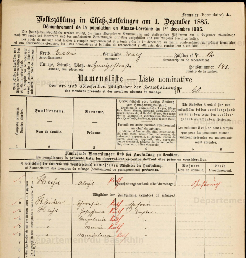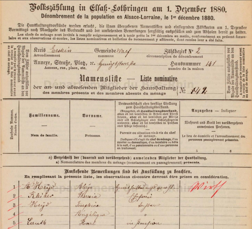 Vers la fin du XIXe siècle, le couple déménage et retourne dans la ville de naissance d'Aloïse, ERSTEIN. Est-ce à cause des décès de leurs enfants, François Antoine né en 1879 qui ne vivra que 3 mois, Marie-Madeleine née le 5 juillet décède le 15 juillet de l'année suivante ou Joseph né en décembre 1886 qui ne vécu qu'une semaine ? C'est à Erstein que s'éteint le père, Aloïse. Le 29 mars 1911, un agent de la poste déclarera le décès du gardien de nuit de fabrique de 56 ans, Aloïse HEYD. Sa veuve, Thérèse, se remarie, l'année suivante, à Eschau avec le veuf, François-Xavier FISCHER, Gussputzer (foulard) qui a eu 10 enfants. Le 21 mars 1921, Thérèse s'éteint à son tour à Erstein.