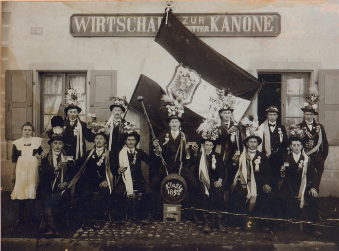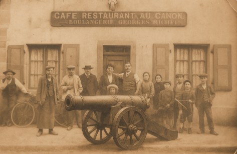 Mais d'où vient le nom de l'enseigne Au canon ? Aucune indication plausible n'est arrivée jusqu'à nous. HEYD aurait-il servi dans un régiment de canonniers ? HEYD est né en 1854 et n'a donc pas participé à la guerre franco-prussienne de 1870. Il a fait sa conscription sous le drapeau allemand. Autre hypothèse, Ce sont ses successeurs, Laurent ROSFELDER puis George MICHEL, qui auraient baptisé le local servant de boulangerie et d'auberge ? Une des filles d'Aloyse HEYD s'appelait Marie Joséphine. Elle a épousé le boulanger Laurent ROSFELDER qui a servi comme soldat en Russie pendant la Première guerre. Le local servait donc de boulangerie. Leur fille, Marie-Anne, épousera le boulanger George MICHEL originaire de Paris et c'est ainsi que l'auberge au canon entrera plus-tard en possession de la famille MICHEL.