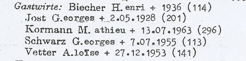 D'après André VOEGEL, dans la rue de l'église, au n°175 se trouvait le café appelé Café à l'Ours, Zum Bären. Ce café aurait été exploité pendant un certain temps par Barbara HIRTZ. Nous avons parlé dans le premier volet de cette série, d'une certaine Barbara HIRTZ, tenancière de l'auberge de l'arbre vert en face de la mairie. Par contre, cette dernière vivait au 18e siècle. Une Barbara Hirtz est décédée en 1915, veuve de Xavier KOECHLER. Ce dernier était menuisier et est décédé en 1895. Sans ressources, il n'est pas impossible que Barbara ait tenté de survivre en ouvrant un café. Elle décèdera sans emploi spécifié.