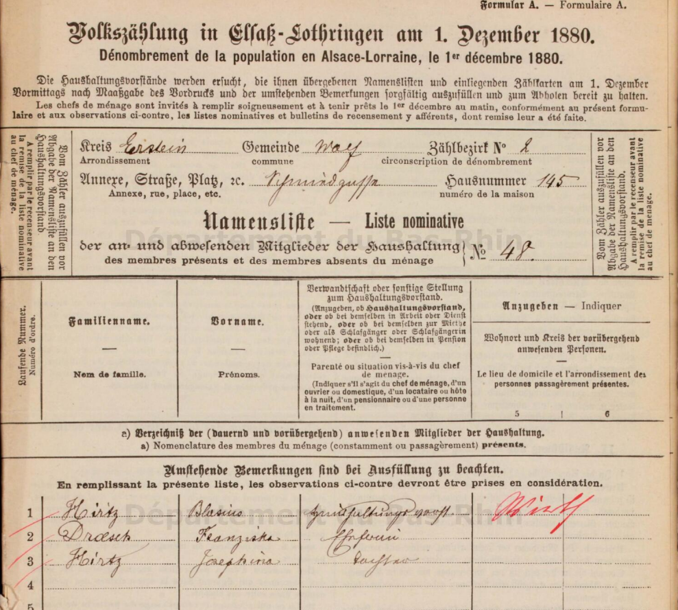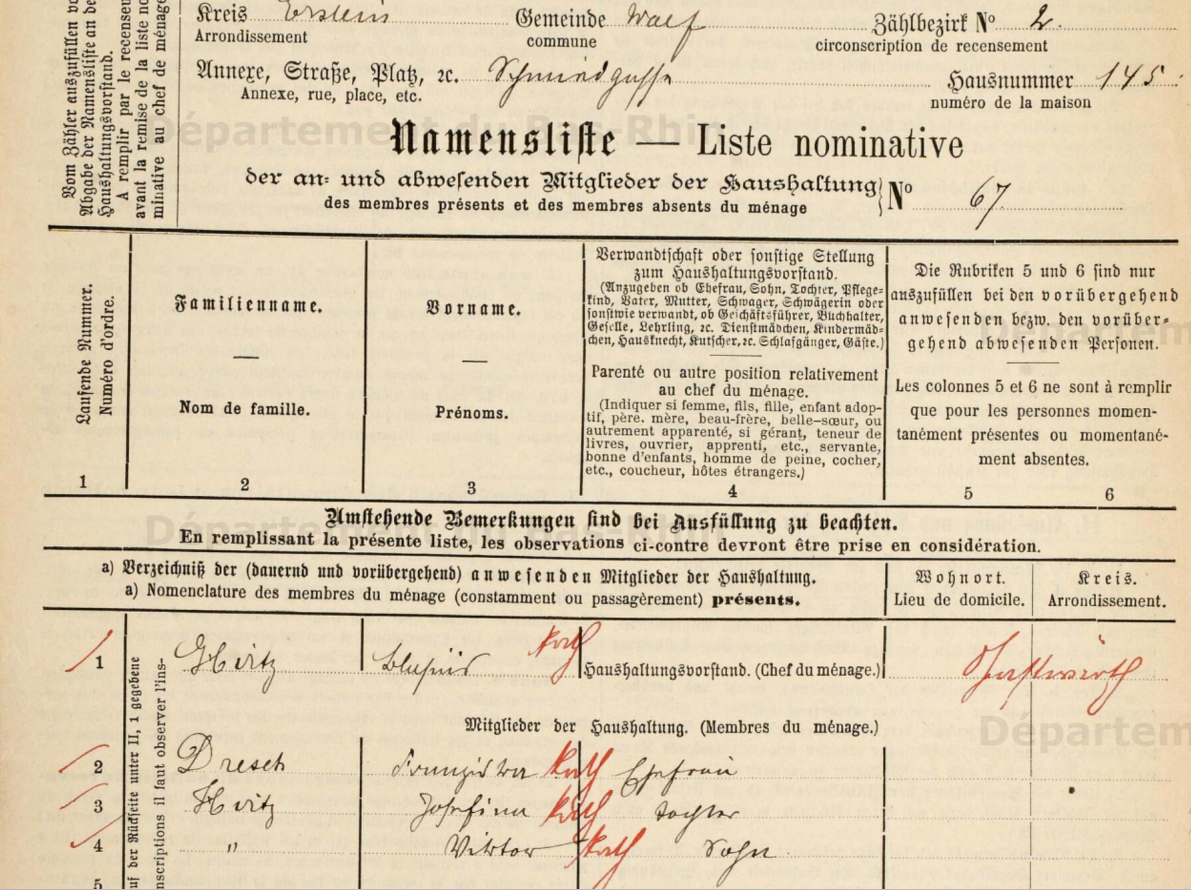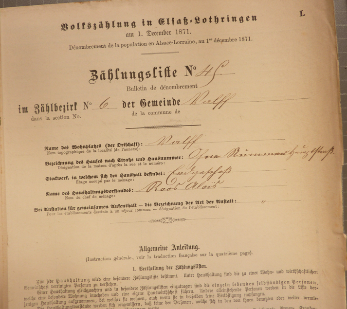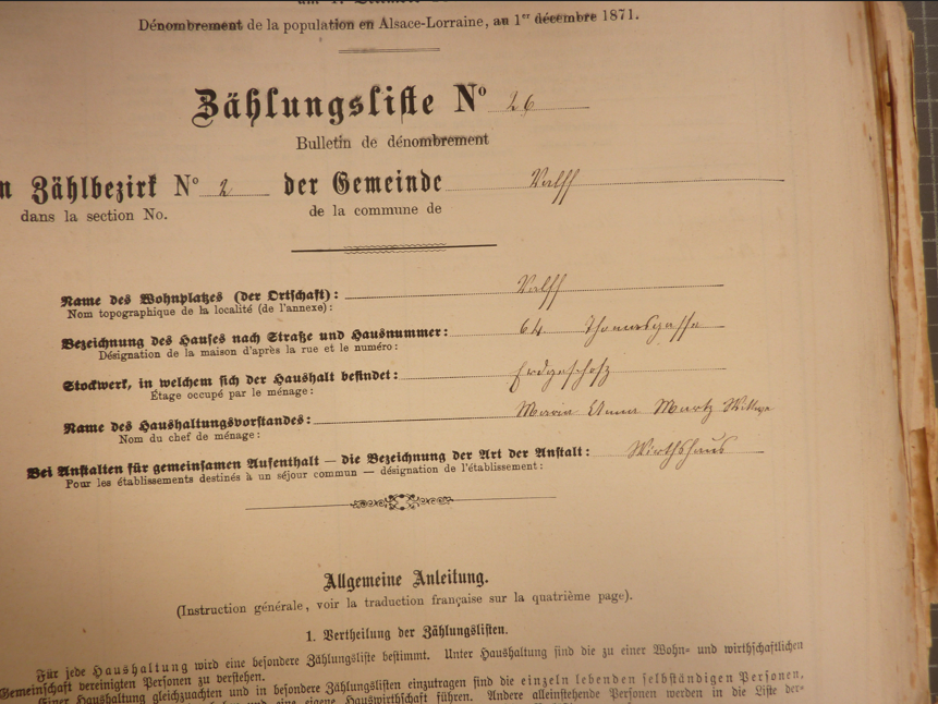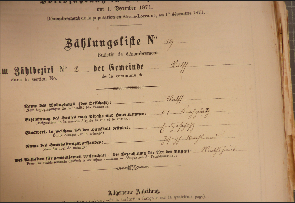 En 1871, l'administration allemande organise un nouveau recensement. La nouveauté ? On détaille enfin le nom des rues ! Enfin ! La première Wirthschaft (auberge) est celle située au lieu appelé Kirchplatz (place de l'église).