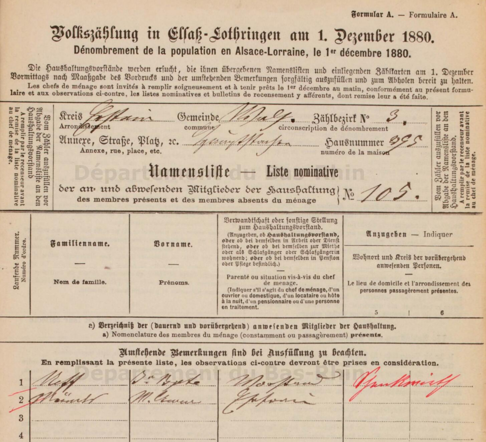 Le recenseur de 1880 a maintenant quelques problèmes d'écriture chez le Schenckwirth Jean-Baptiste NEFF au bout du village. Constatez par vous-même comment il écrit le numéro de maison 295.