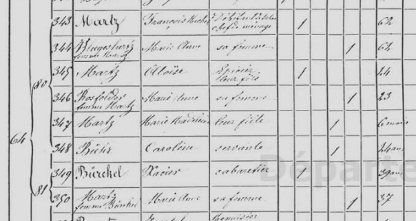En 1866, l'auberge est conjointe à une épicerie gérée par MARTZ Aloïse et son épouse ROSFELDER Marie-Anne. L'auberge en elle-même est la propriété de BURCKEL Xavier qui a épousé MARTZ Anne-Marie, la sœur d'Aloïse, citée étant veuve dans le relevé de 1871. Effectivement, son mari Xavier BURCKEL est décédé le 5 juin 1871, l'année du recensement.