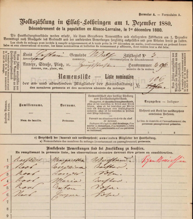 Marguerite a épousé Aloïse ROOS d'Aldorf. Aloïse exerçait le métier de hongreur (castreur de chevaux, vétérinaire). Ce dernier décède le 14 avril 1880 à 40 ans. Le 4 octobre, Marguerite met au monde une fille qui décède à la naissance. Malgré les malheurs qui s'accumulent, elle élève seule ses cinq enfants. Elle décèdera, elle aussi, brusquement, sous le poids des responsabilités, à 35 ans, l'année suivante du recensement, le 11 mars 1881. Les enfants trop jeunes seront recueillis. Le nom S'Rueffe Nannel venait donc du nom de famille ROOS et l'auberge n'a pas appartenu à un certain Munch comme le pensait André.