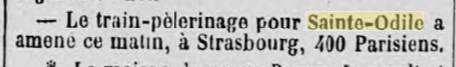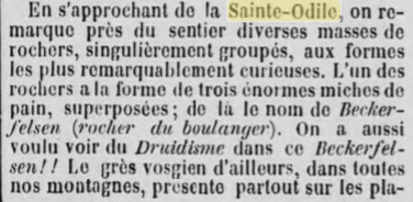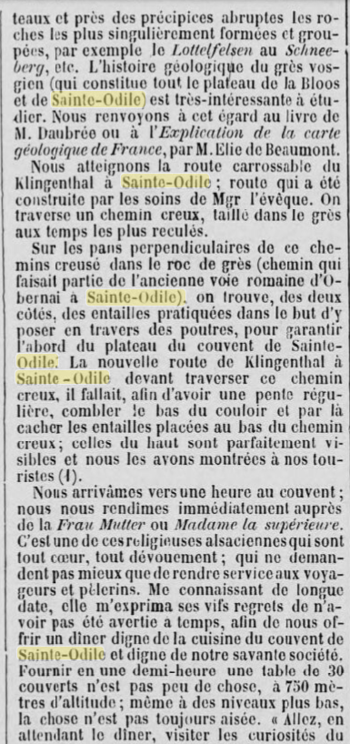 25 mai 1899, concernant les projets d'infrastructures en Alsace. La construction et le nouvel aménagement d'une route carrossable reliant Hohwald au Mont Sainte-Odile (Odilienberg), ainsi que d'une autre route partant de Barr, traversant la vallée de Barr via le Maennelstein pour rejoindre la route susmentionnée, débuteront encore cette année. Les travaux doivent être menés de manière à ce que les deux liaisons vers le Mont Sainte-Odile puissent être mises en service dès l'année prochaine. Grâce à ces deux nouvelles routes, la circulation dans cette belle partie des Vosges sera grandement favorisée et l'exploitation de vastes zones forestières sera considérablement facilitée. La route Hohwald-Mont Sainte-Odile aura une longueur de 9,8 km ; celle partant de Barr par le Maennelstein, se raccordant à la route précitée depuis la place du bois (Holzplatz), sera nouvellement aménagée sur 5,60 km. À l'avenir, la longueur de la route carrossable entre la gare de Barr et le Mont Sainte-Odile sera d'un peu plus de 10 km.