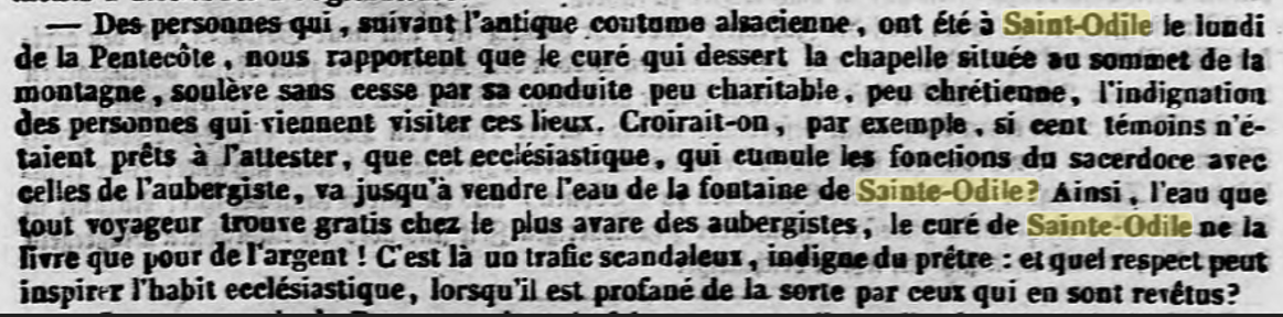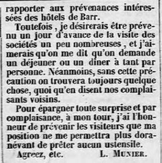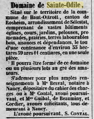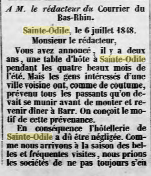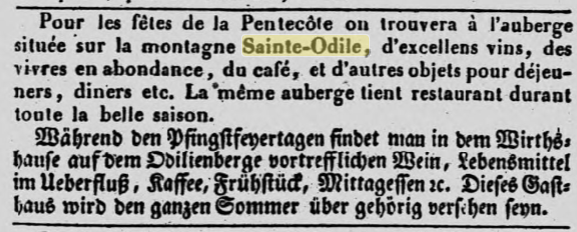 Cette dernière se trouve non loin du domaine de Niedermünster, situé au pied de la montagne, qui appartenait jusqu'alors à la famille TAUFLIEB de Barr (dont l'ancêtre juif de Valff se converti au catholicisme en 1781, en savoir plus : La saga de la famille TAUFFLIEB) et qui a été cédé l'année dernière à l'évêché de Strasbourg. Par conséquent, l'auberge qui s'y trouve cessera d'exister à la fin du bail actuel. Cette halte était bien connue de tous les visiteurs des Vosges.