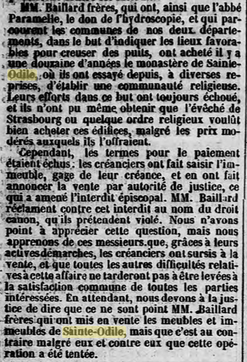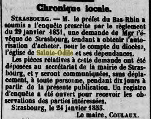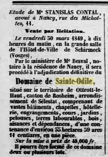 1853, c'est la date clé. Monseigneur ANDRES (André RAESS), évêque de Strasbourg, rachète le Mont Saint-Odile grâce à une souscription publique pour lui rendre sa vocation religieuse.